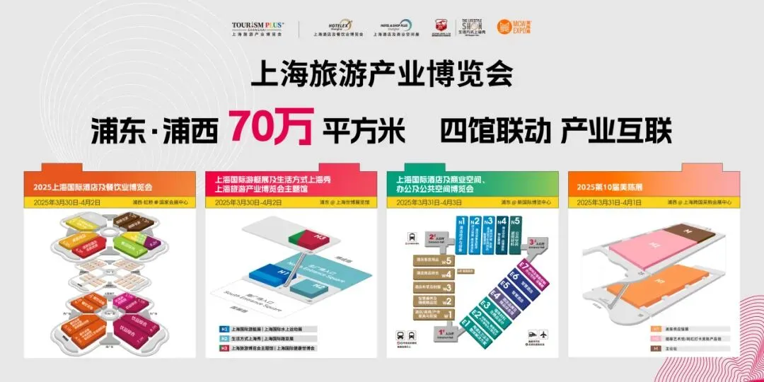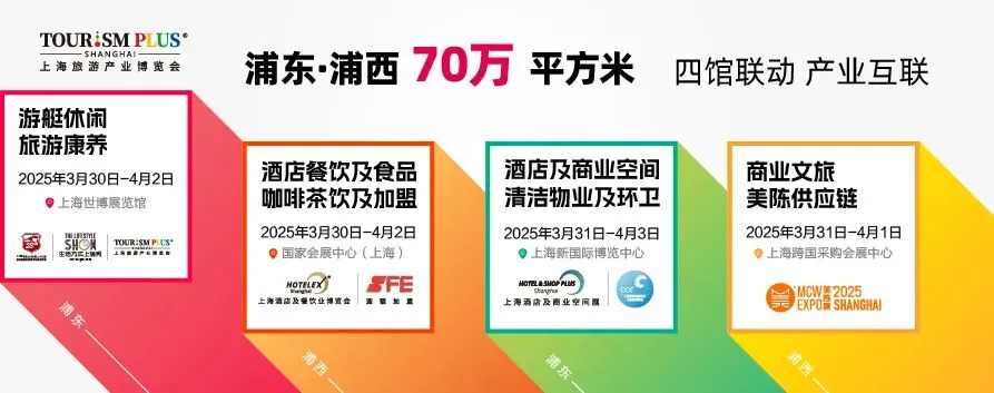 2025年3月30日-4月3日,2025上海旅游产业博览会将以五个集群展、浦东浦西四个展馆,总展出面积70万平方米,覆盖15个产业大类,68个展览板块,6000多家展商,300多场现场活动的规模,创造历史新高!预计将吸引来自全球140多个国家和地区的45万观众到场参观。