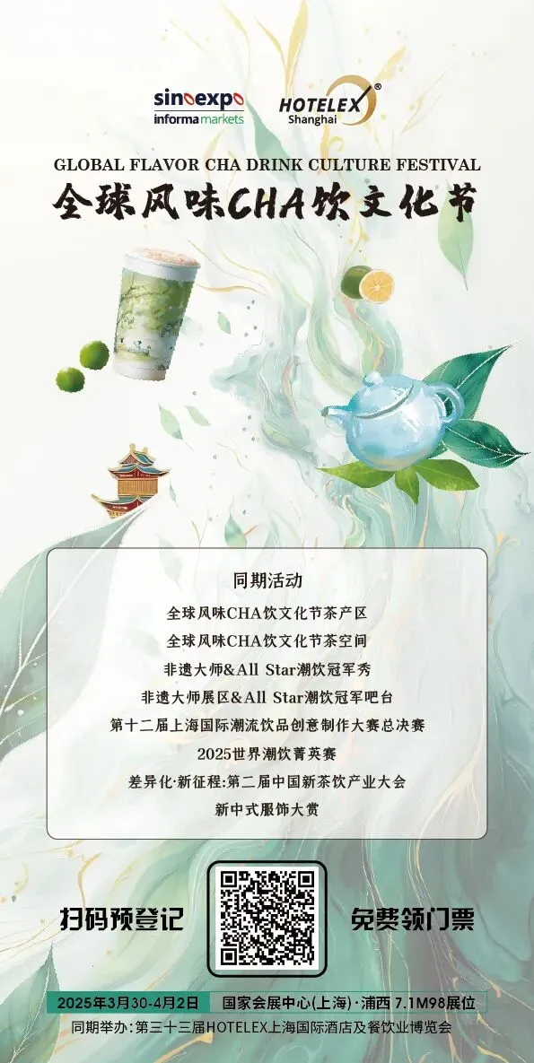 “全球风味CHA饮文化节”是今年首发的一个面向“Z世代”茶饮消费者的生活方式节,包含新茶饮快闪店、茶空间、茶产区、非遗大师 & All star潮饮冠军秀、潮饮大赛总决赛及世界潮饮菁英赛、新茶饮大会、新中式服饰大赏等丰富内容,将主题论坛、专业赛事及活动、特色展区融为一体,搭建一个集智慧碰撞、技艺展示、文化传承与创新探索于一体的国际化平台,引领全球茶行业的未来发展潮流。