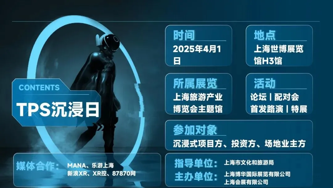 为了促进沉浸产业与文旅产业的融合发展,促进文旅景区景点、商业购物中心引进沉浸式文旅项目,尤其是近期蓬勃发展的LBE大空间项目,上海旅游产业博览会主题馆特将特设“TPS沉浸日”活动,通过论坛、投资配对会、首发路演、特展等形式,向文旅产业推介优质沉浸式项目。