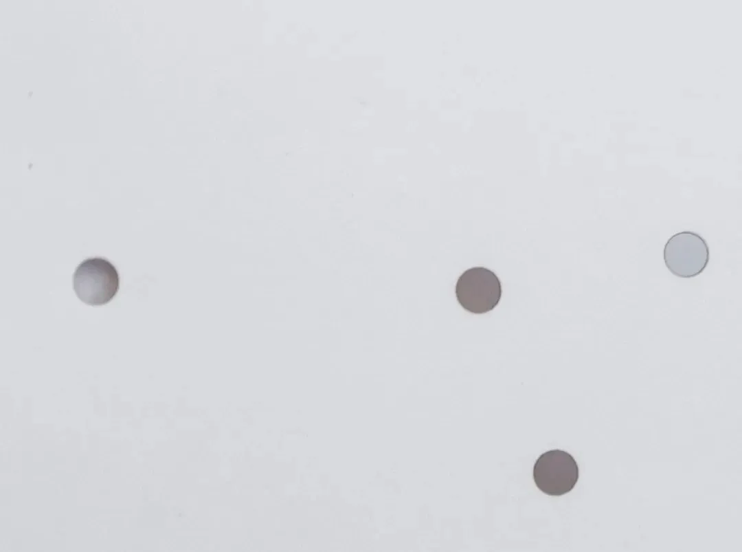 陈佩涵:我们的关注点主要放在了展览主题与艺术家作品间的关系。“无声之声”在语义上是对立与统一的,“无声”是物理层面没有声响,“之声”是一种明确的声音,是需要被听到的讯息。由此我们产生一个疑问:一个“不存在”的东西,如何拥有“存在”的属性?或许这种悖论的主题本身指向一种不同于常规感官的体验,我们在阅读过艺术家的作品后,利用“节奏感”来翻译这一关系。“节奏感”可以没有物理声响,但能引发深层共鸣的规律变化,在某种层面上代表着艺术家内在有序思考的体现。具体设计中,我们提取了展览作品中的元素“圆”,将它与文本信息进行编排,三张海报的信息最终通过圆的相对位置建立阅读的顺序。在具体圆的表达中,我们关注到艺术家作品中的圆有平面和三维立体两种呈现。因此我们将海报印刷在纸张后,在表面进行打孔处理,把它放置在单一光源在白背景,并通过摄影的方式捕捉圆孔下不同变化的光影效果。圆孔下的光影不同,圆孔就形成平面圆形和立体球状的视觉转化,这也回应了与主题相关的对立与统一的视觉关系。