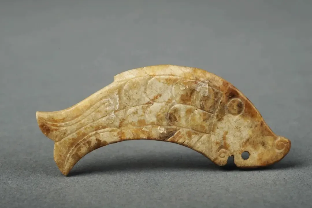玉质黄白色,扁平状。鱼身微曲,圆眼,张嘴,双面阴刻鱼鳞、鱼鳍、鱼尾。头部有一个穿孔。