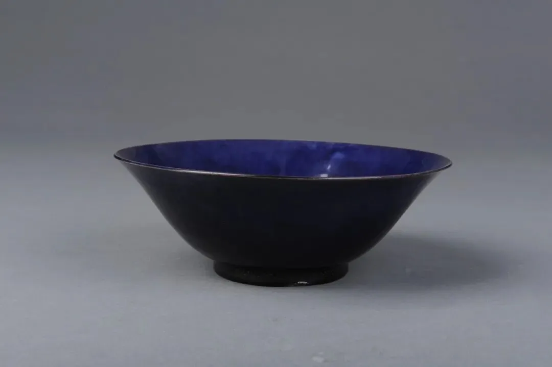 侈口,腹斜收,圈足。胎质白细。里外均施兰釉泛紫,呈深茄色,素面。釉层坚硬,釉色均匀肥厚。足内不施釉,多棕眼,并有三个垫烧迹。茄皮紫釉起源于明代弘治年间,以锰为呈色剂,在清代得到进一步发展。尤其在康熙、雍正、乾隆时期最为精美,其特点是釉色纯正、施釉均匀、造型典雅,成为宫廷御用瓷器中的珍品。