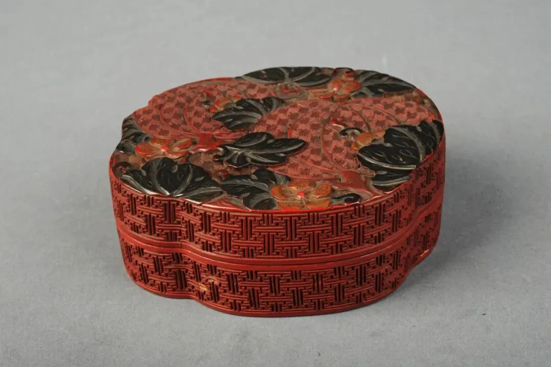 清代漆器造型多样,独特新颖,用色繁复,可谓空前绝后。从器形上看,该器为随形盖盒;从色彩上看,剔黑为主,又融合了朱漆、绿漆、黄漆,色彩既丰富又协调,增加了色彩丰实感和层次感。盒面雕刻花果藤蔓,盒侧面剔红锦地纹饰。