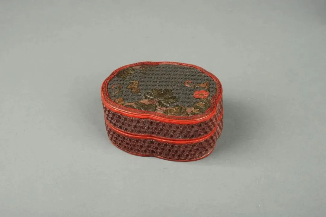 雕漆,又称剔红、剔黄等,是中国传统漆器工艺。其以天然大漆为原料,在胎体表面逐层髹涂至一定厚度后进行雕刻,需经画图、制漆、髹漆等百余道工序完成。此盒呈椭圆形花叶状,子母口。盖顶呈平面,浮雕瓜叶,髹墨绿、红、黄色漆,表面其余部分髹红色漆,盒内髹黑色漆。