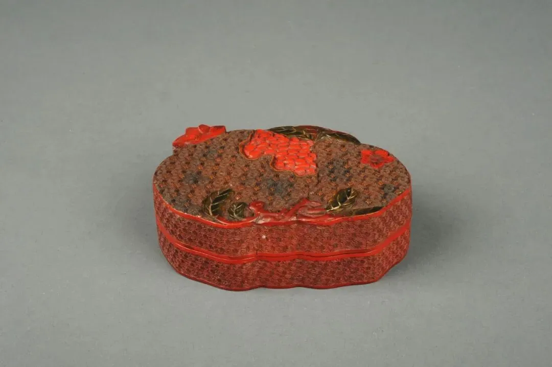 盒呈石榴形,盒面雕刻一枚半裸露的石榴,枝、叶、仔、花蒂均采用不同的色彩,剔黑锦纹为主,又融合了朱漆、绿漆、黄漆等,色彩丰富协调,增加了色彩丰实感和层次感。清代漆器造型多样,独特新颖,用色繁复,可谓空前绝后,由此器可窥一斑。
