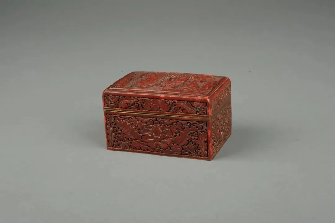 漆盒铜胎呈长方形,内嵌黑漆,盒身雕刻牡丹花,构图疏密得当,线条流畅,精美别致。盒盖边沿正中间剔雕一只蝙蝠,蝠首向下,与盒身牡丹相呼应,两侧剔雕牡丹。盒盖顶部剔雕人物树石,两农夫手持农具,裤角上挽、赤脚,相对而坐,做交谈状。景物人物刻画细腻,线条流畅,刀法高超。