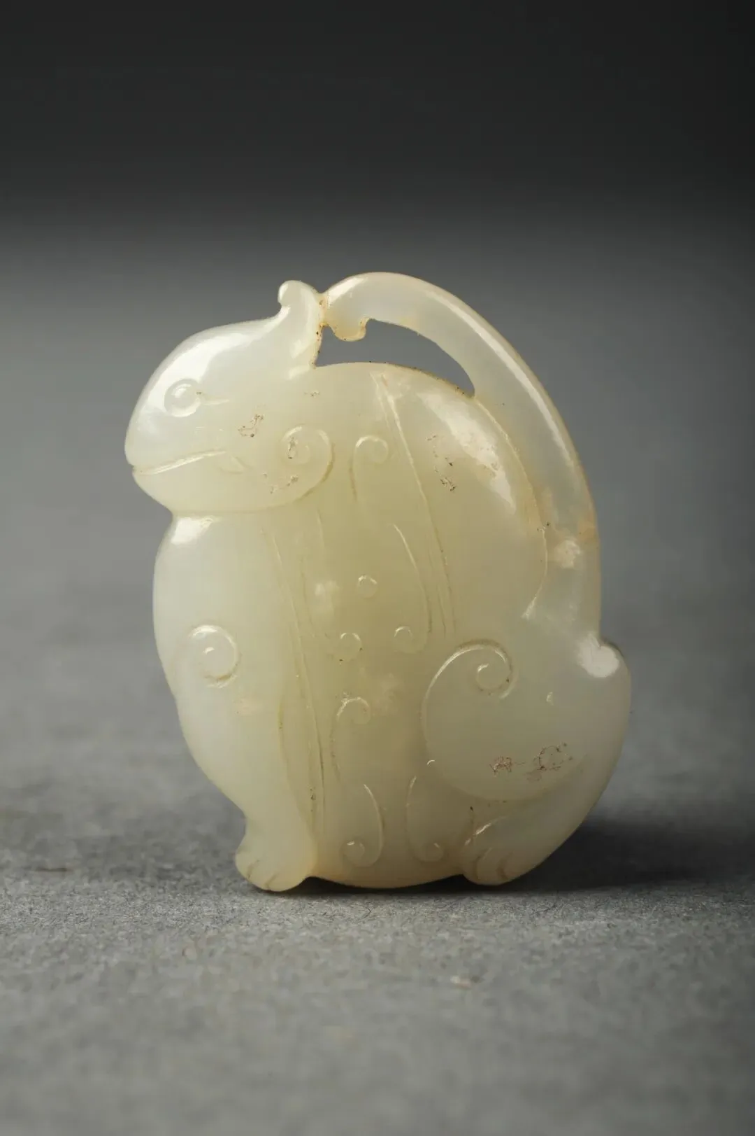 玉质呈白色。体扁平,似兔形,耳上翘,单阴刻线刻出水滴眼、嘴、脚趾及腿弯曲处的卷毛,双腿蹲曲似欲跳跃,尾巴上卷接于耳处。兔身两面刻饰勾云纹。