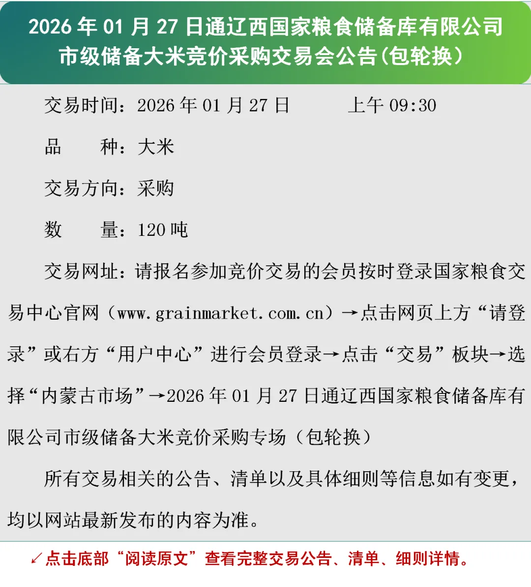 2026年01月27日通辽西国家粮食储备库有限公司市级储备大米竞价采购交易会公告(包轮换)