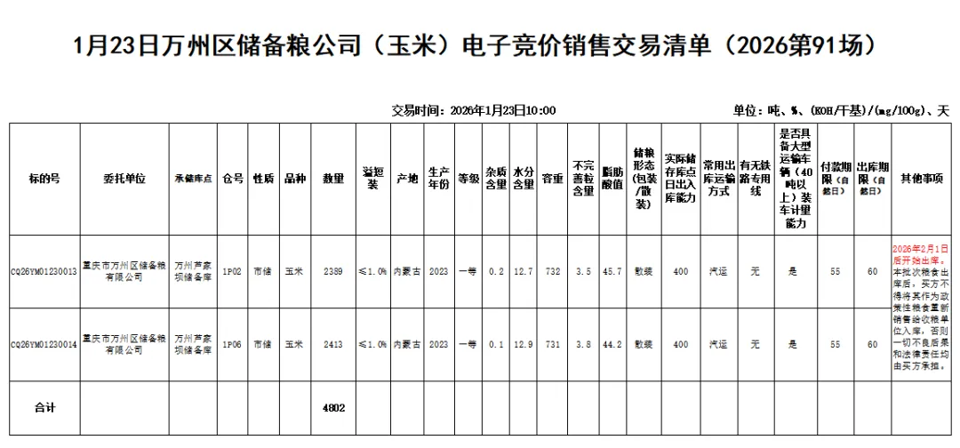 受重庆市万州区储备粮有限公司委托,重庆市粮油批发市场有限责任公司(即国家粮食重庆交易中心,以下简称“批发市场公司”),定于2026年1月23日10:00举办万州区储备粮公司(玉米)电子竞价销售交易会,现将有关事项公告如下: