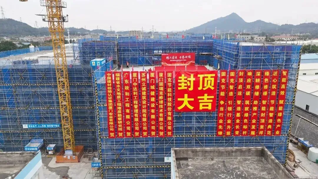 2026年1月22日上午,固克节能科技股份有限公司(以下简称“固克”)位于厦门市同安区的绿色修缮智能制造基地顺利实现主体结构封顶。从2025年6月16日正式开工到2026年1月22日封顶,仅用7个月时间,刷新了国内建筑修缮类智能制造项目从破土到主体完工的建设速度纪录。