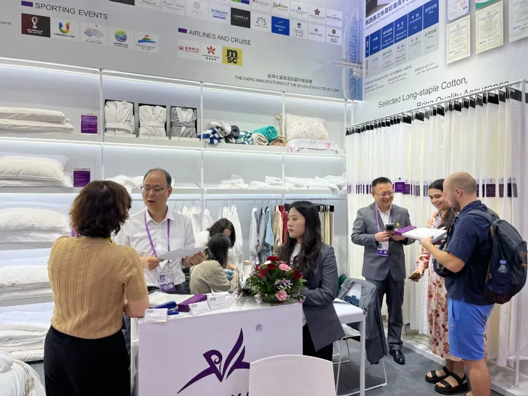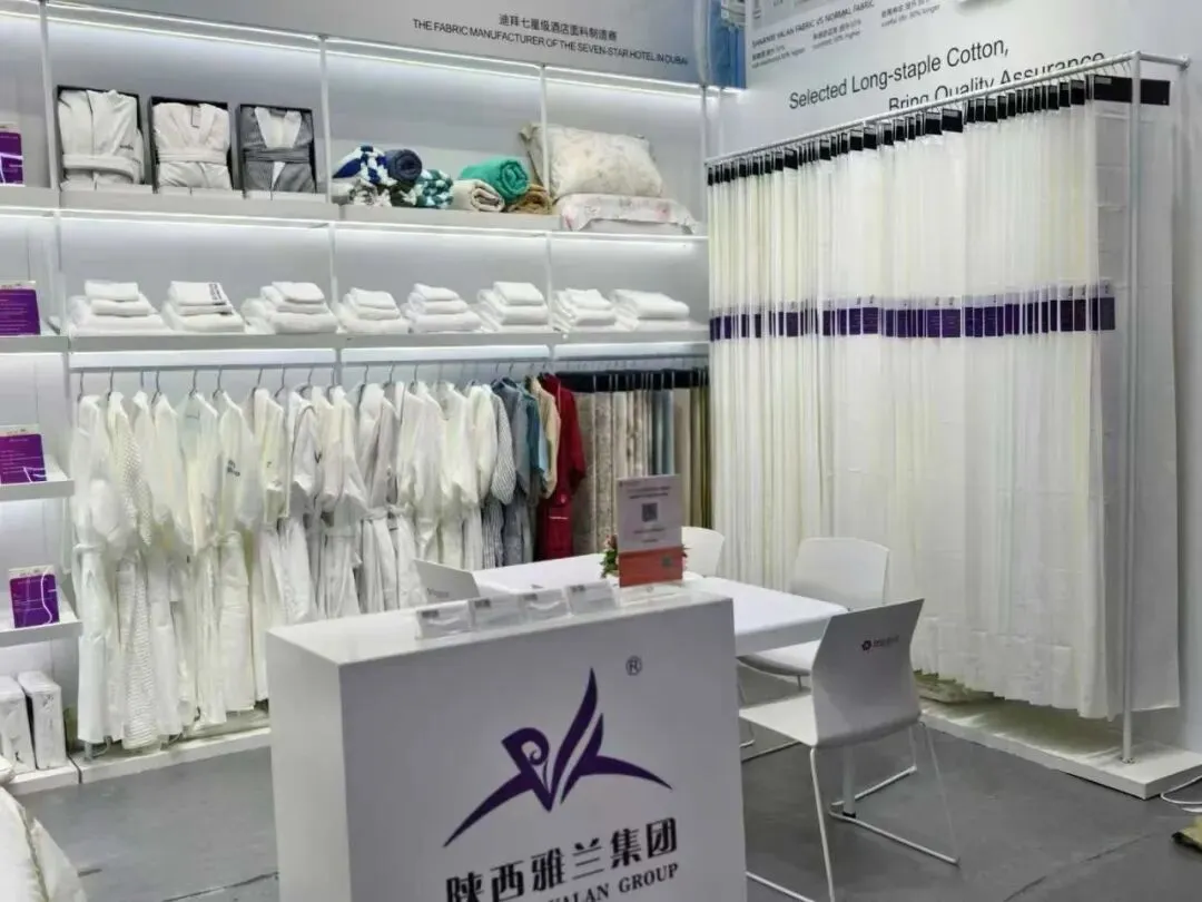 展会上,全面呈现了陕西雅兰寝饰研、产、销一体化优势,不止展示产品,更彰显高端定织能力与专利工艺;现场专业团队为参观商客提供“一站式”布草解决方案,精准适配多样化需求。