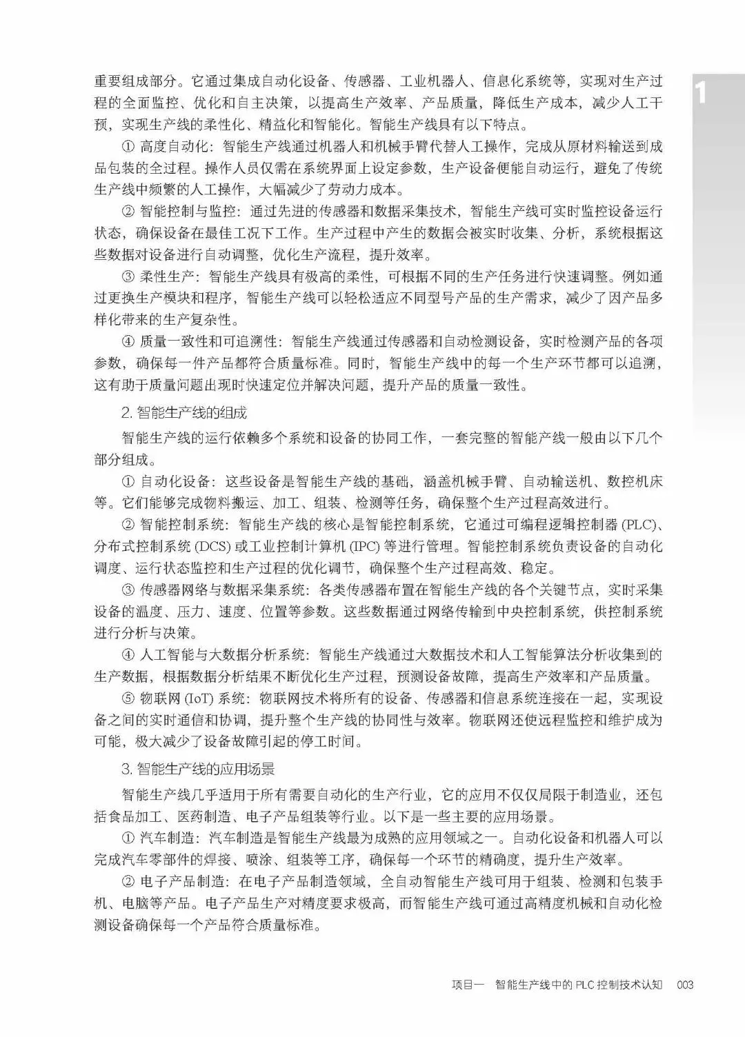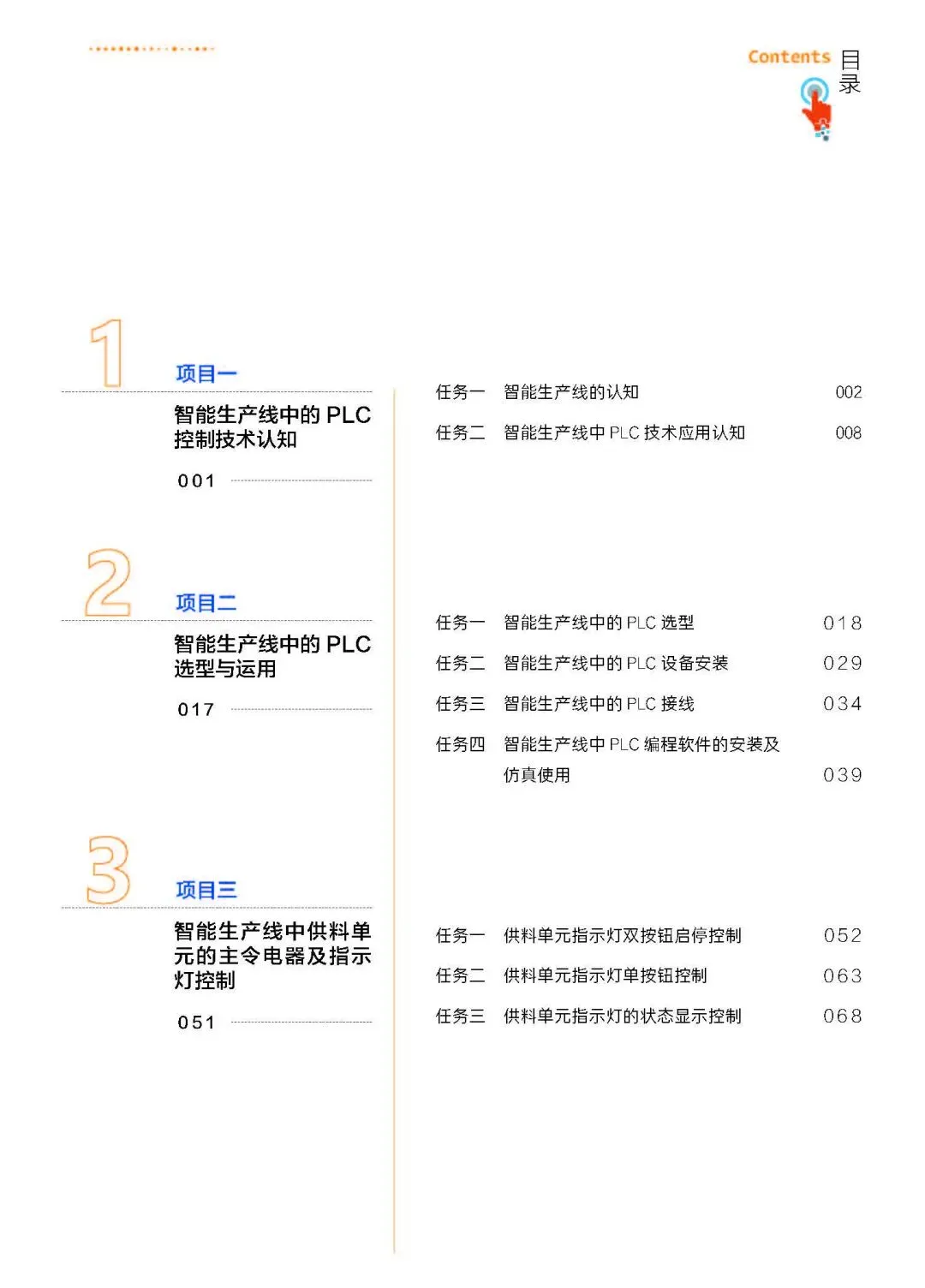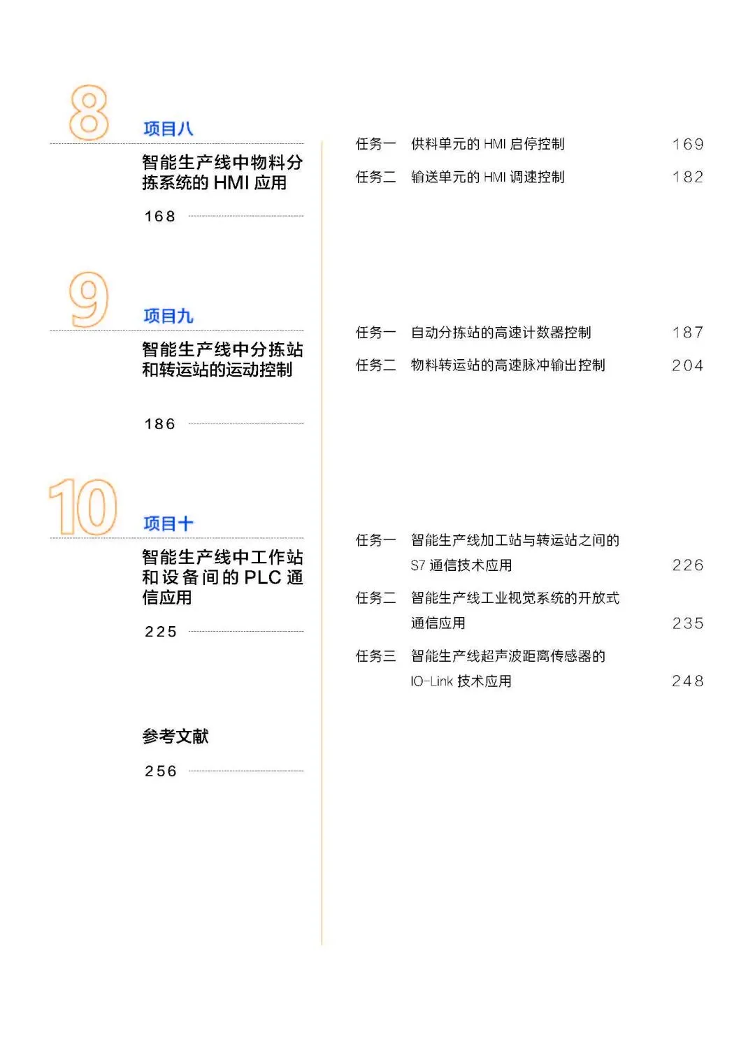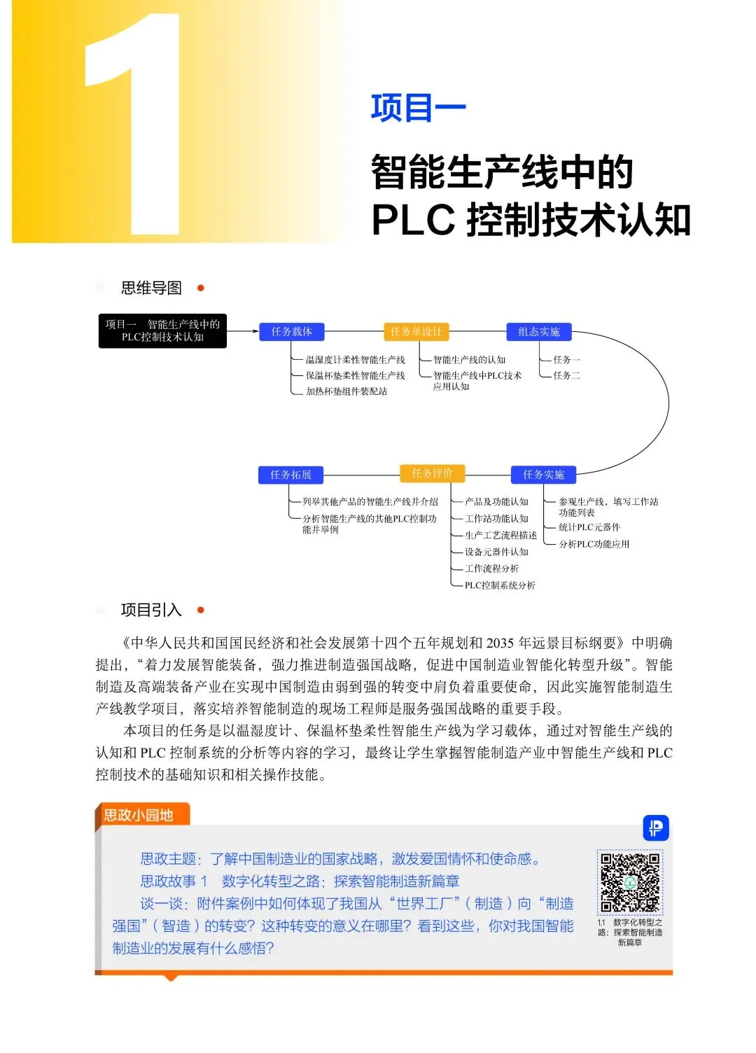 全书共十个项目,每个项目细分为若干典型任务,在任务设计和实施过程中,目标清晰,步骤详尽,内容由浅入深、层层递进和理实结合,不仅包括了 PLC 等技术中常规的知识点、硬件安装、电气接线、编程调试等学习内容,还将结构化编程、多站通信、工业视觉、IO-Link智能传感器等前沿技术的理论知识和操作技能进行了融入。学习者通过完成各阶段任务,最终能实现对完整智能生产线系统的控制与集成,深刻理解 PLC 在复杂系统中的核心作用。