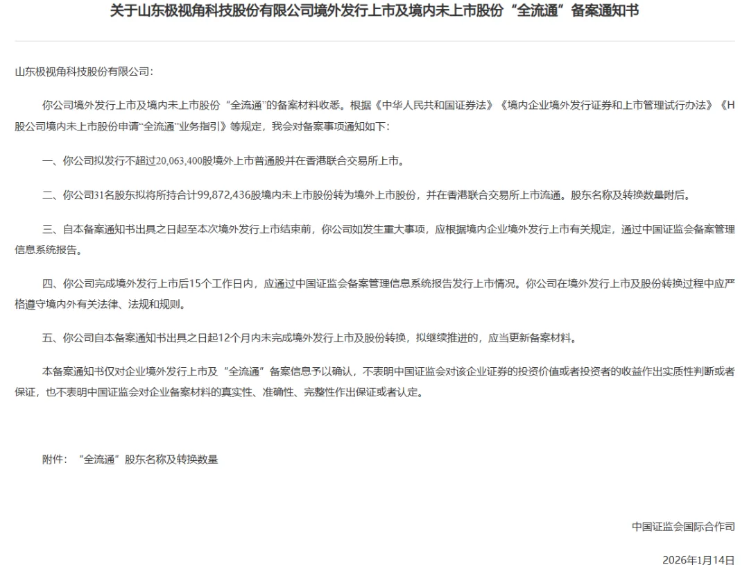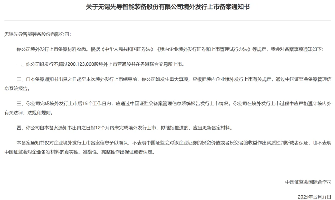 2026年1月21日晚,中国证监会对先导智能、极视角境内企业境外发行上市予以确认,2家均为赴港上市备案。