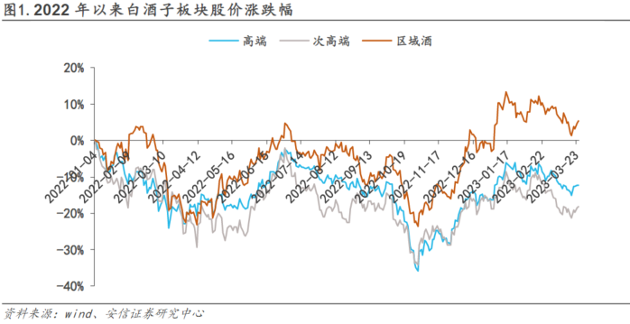 从2022年10月板块底部至春节后,股价涨幅较大,但基本面缺少催化,市场预期对经济复苏的节奏和力度产生分歧,因此市场对白酒板块估值部分兑现,近期股价走势较弱。