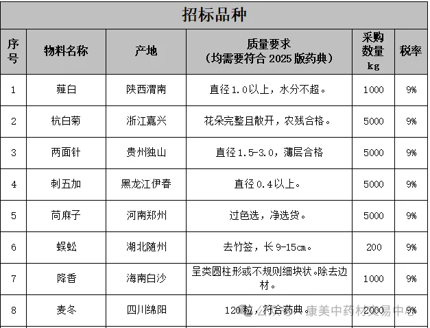 康美(亳州)供应链有限公司现进行中药材原料招标采购,我司诚挚邀请您参与本次招标。以下是本次招标的详细信息:
