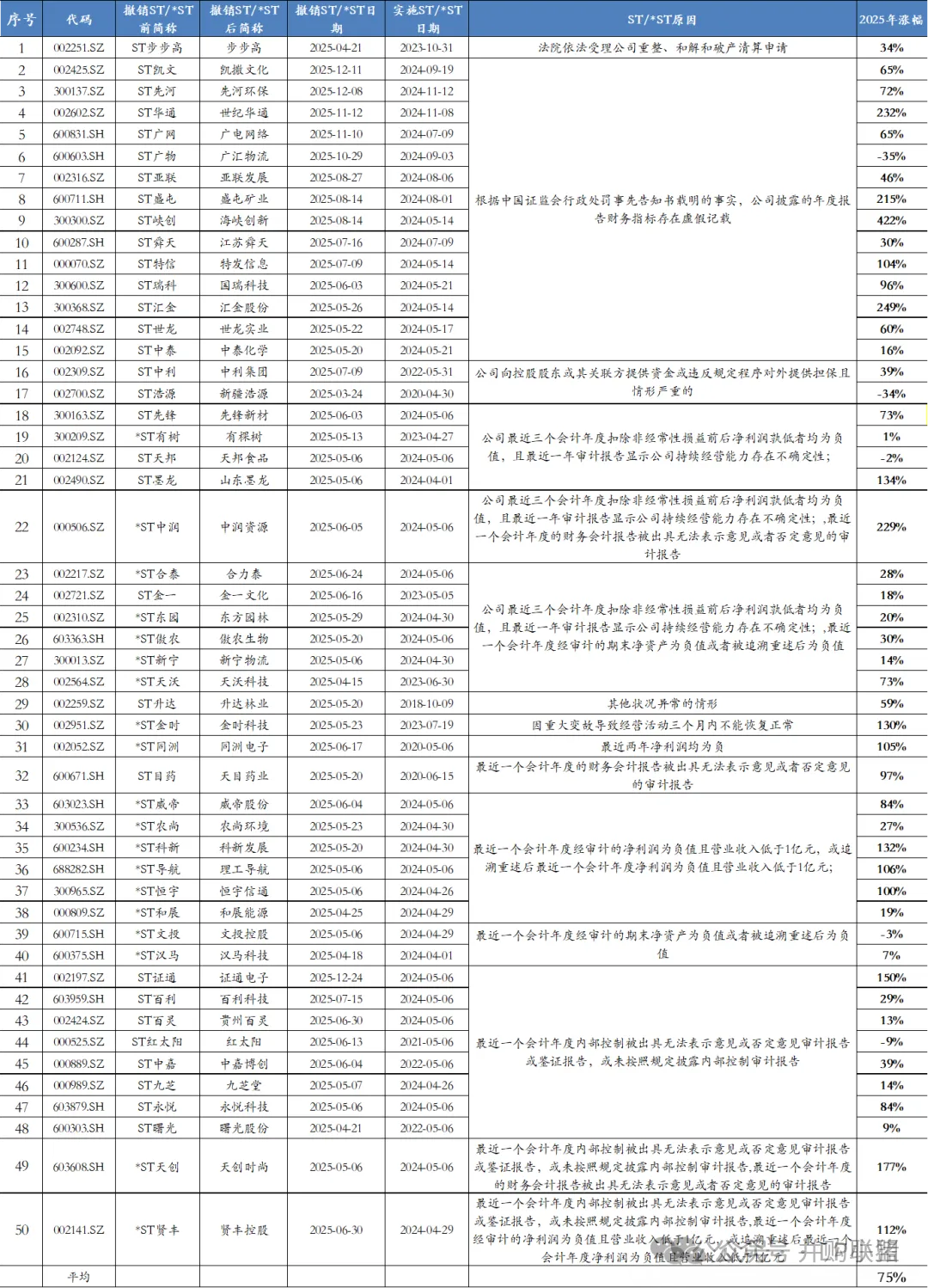 在退市常态化的市场环境下,2025 年共有 50 家 ST 或 * ST 公司通过改善经营、破产重整、剥离亏损资产等方式成功 “脱星摘帽”,占全年警示类公司总数的近三成。这部分企业不仅摆脱了退市风险,更在资本市场引发强烈反响,摘帽后股价平均涨幅高达 75%,成为年度市场亮点。其中,海峡创新以 422% 的惊人涨幅领跑全场,其股价暴涨得益于平潭综合实验区 “数字中国” 试点的政策催化、2024 年业绩扭亏带来的估值修复,以及游资对 “小市值 + 国资云” 概念的集中炒作,全年换手率超 200%。值得注意的是,除海峡创新外,*ST 铖昌、ST 宁科等公司也凭借摘帽预期或重整利好,在特定时段实现股价翻倍,展现出风险警示板块的结构性机会与高波动性特征。