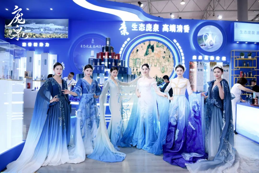 庞泉定位“生态酒庄”,因此从产品设计到展位装修,都体现了自然生态之美,渐变的蓝色,成为庞泉的主色调,极具视觉冲击力!庞泉的展厅也吸引了厂商的目光,大家停留下来,了解庞泉酒所处产地、工艺特点以及市场规划。