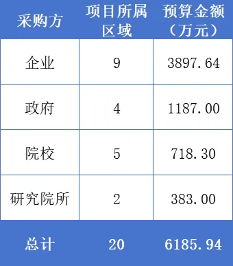 详细来看,企业方面有9个采购需求,采购预算达3897.64万元;政府方面有4个采购需求,预算总计1187万元。