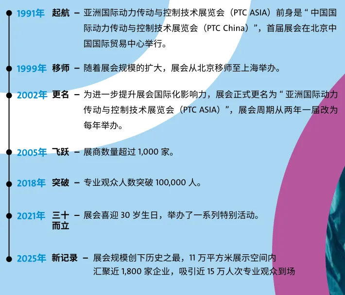 2026上海PTC传动展 | 核心零部件采购平台自1991年首次启航,PTC ASIA已在动力传动与控制领域深耕三十余载。作为行业发展的见证者与推动者,我们始终致力于搭建集品牌展示、贸易合作与技术交流于一体的高端平台,持续赋能产业智能化升级,助力行业向智能制造迈进。