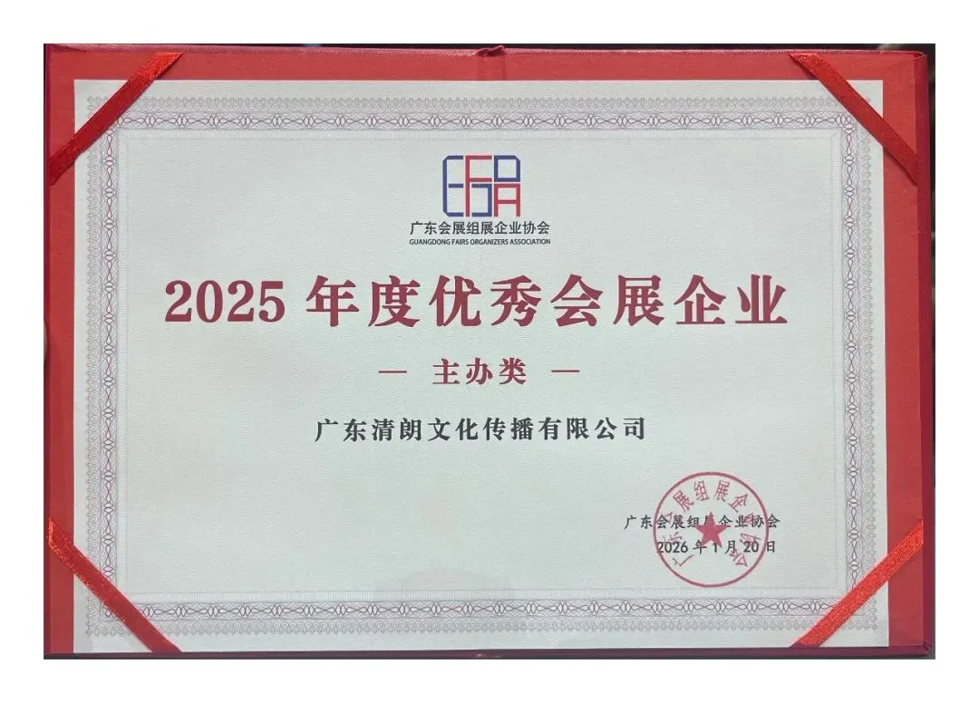 广东清朗文化传播有限公司专业从事组织、策划与服务国内外大型展览、会议、活动及文化传播等业务。自成立以来,公司始终将服务质量视为立身之本、发展之基,积极与国际接轨,全流程遵循国际标准化运作体系。历经多年深耕探求与实战历练,清朗文化在组展业务上积累了丰富经验,凭借专业素养与细致服务,在会展业界赢得了良好口碑。此次获奖,既是荣誉,更是动力,清朗文化将继续坚守组展人初心,以更专业的能力、更细致的服务,为客户打造优质展会、创造核心价值。
