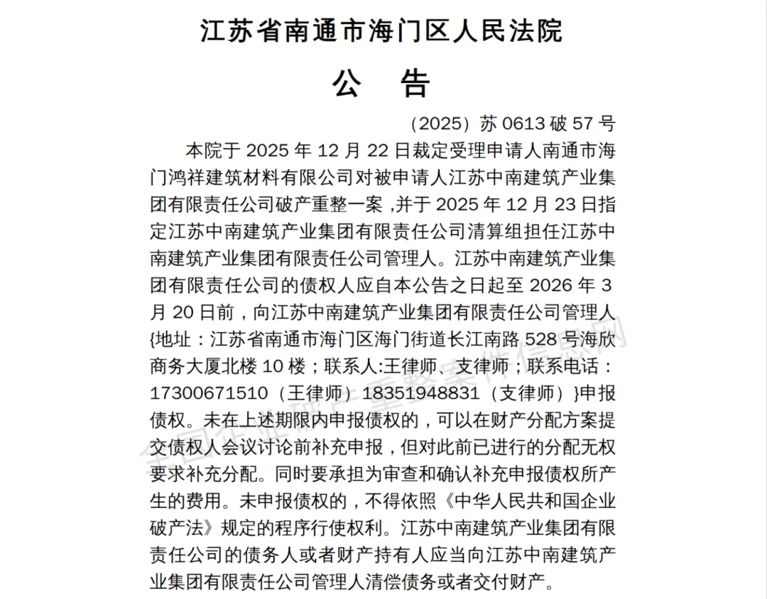 我们今天就拿江苏中南建筑产业集团有限责任公司破产重整一案举例。