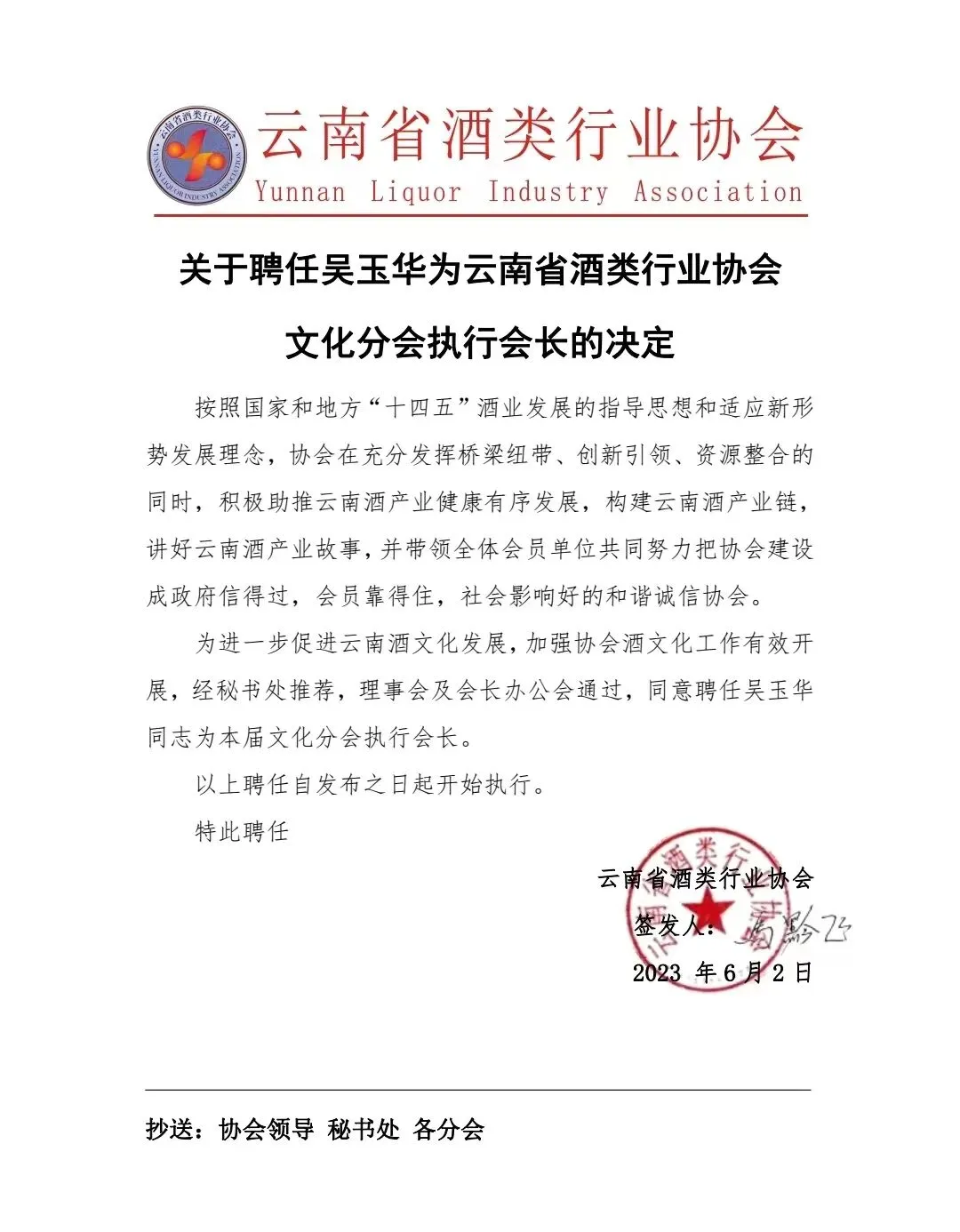 今临此任,既感千钧之托,亦怀万丈之忱。余必以文心驭酒事,使玉液琼浆皆含诗韵;以史笔铸酒魂,令陈酿新醅尽蕴沧桑。当振臂一呼,聚业界之英贤,共襄济世之盛举;举旗引领,汇文化之涓流,成其滔天之势。探滇酒之千年渊源,钩沉史海;辑云酿之百代掌故,补缀文荒;弘古法酿造之精粹,薪火相传;扬雅集品鉴之风流,声名远播。愿以己身为舟楫,架文酒相融之津梁,渡产业于坦途;以薄才为星火,燃产业勃兴之燎原,照前路之辉煌。期使滇酒之香,冲霄汉而漫四海,香透千村万落;酒文之韵,贯古今而泽千秋,韵流百代千年!
