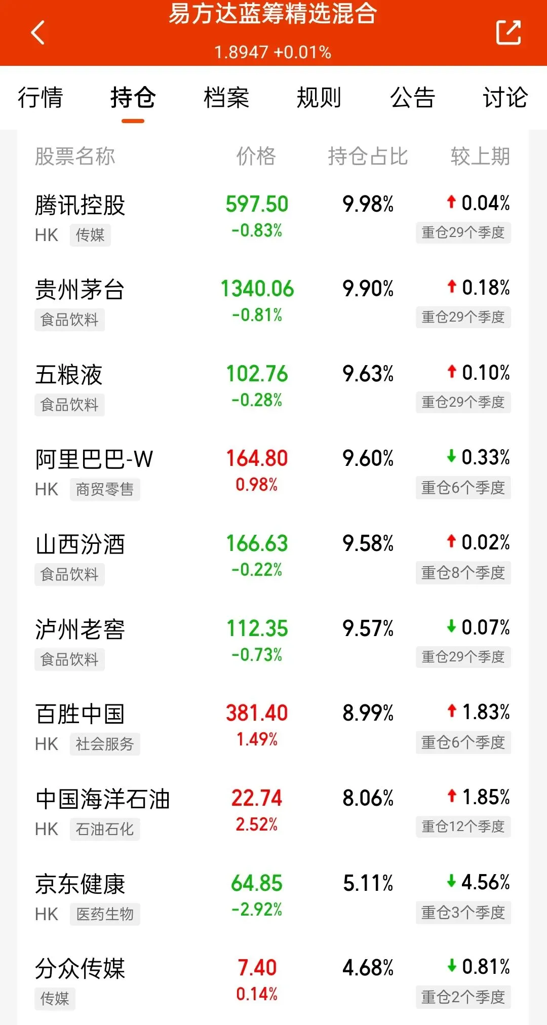 易方达蓝筹精选混合基金第四季度的白酒仓位仍然满满仓位上限。除了重仓的腾讯,就是重仓的贵州茅台和五粮液,仓位几乎最可能限度的接近10%。接下来的还有山西汾酒和泸州老窖,也约等于10%的仓位。