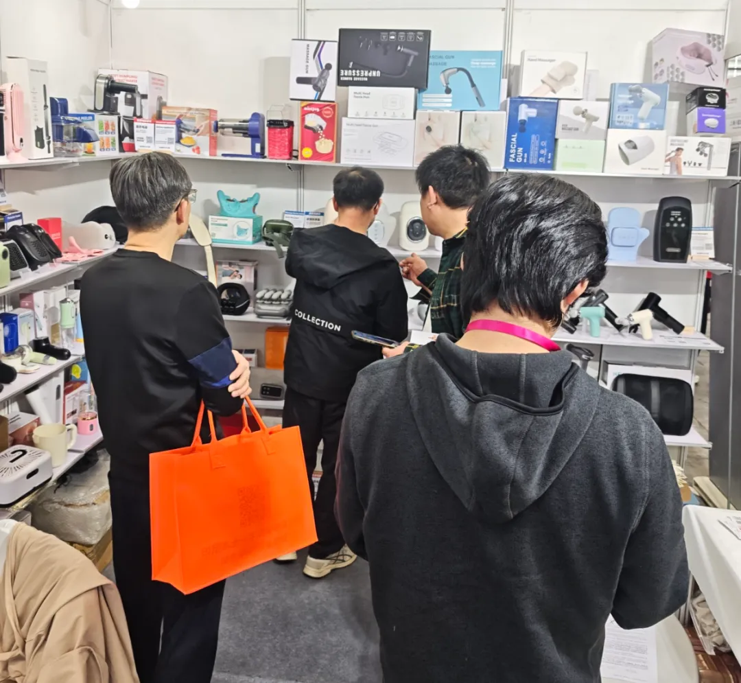 有专门冲这些爆单款来的达人,上手试完筋膜枪,立马就拉着咱聊供货;还有各地来的采购老板,在样品区,挨个看细节、问报价,特认真;还有之前合作过的老客户,特意绕路过来瞅新品,还说“你们家品质一直靠谱,从来没让人失望过”