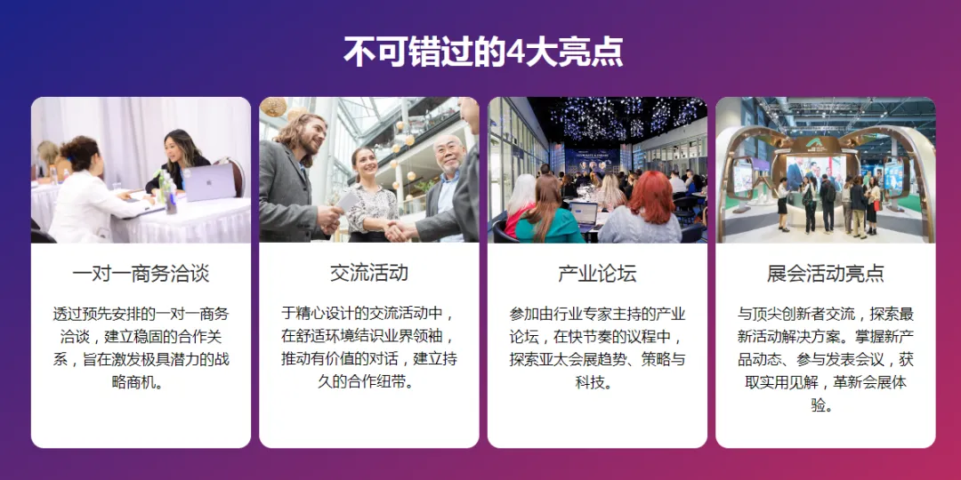 作为亚太区内极具影响力的专业商务盛会,现场将汇聚来自30多个国家和地区的超过300家全球供应商与特邀买家,并通过超过3,000场预先安排的一对一洽谈、行业交流及战略合作活动,助力您实现高效精准对接。