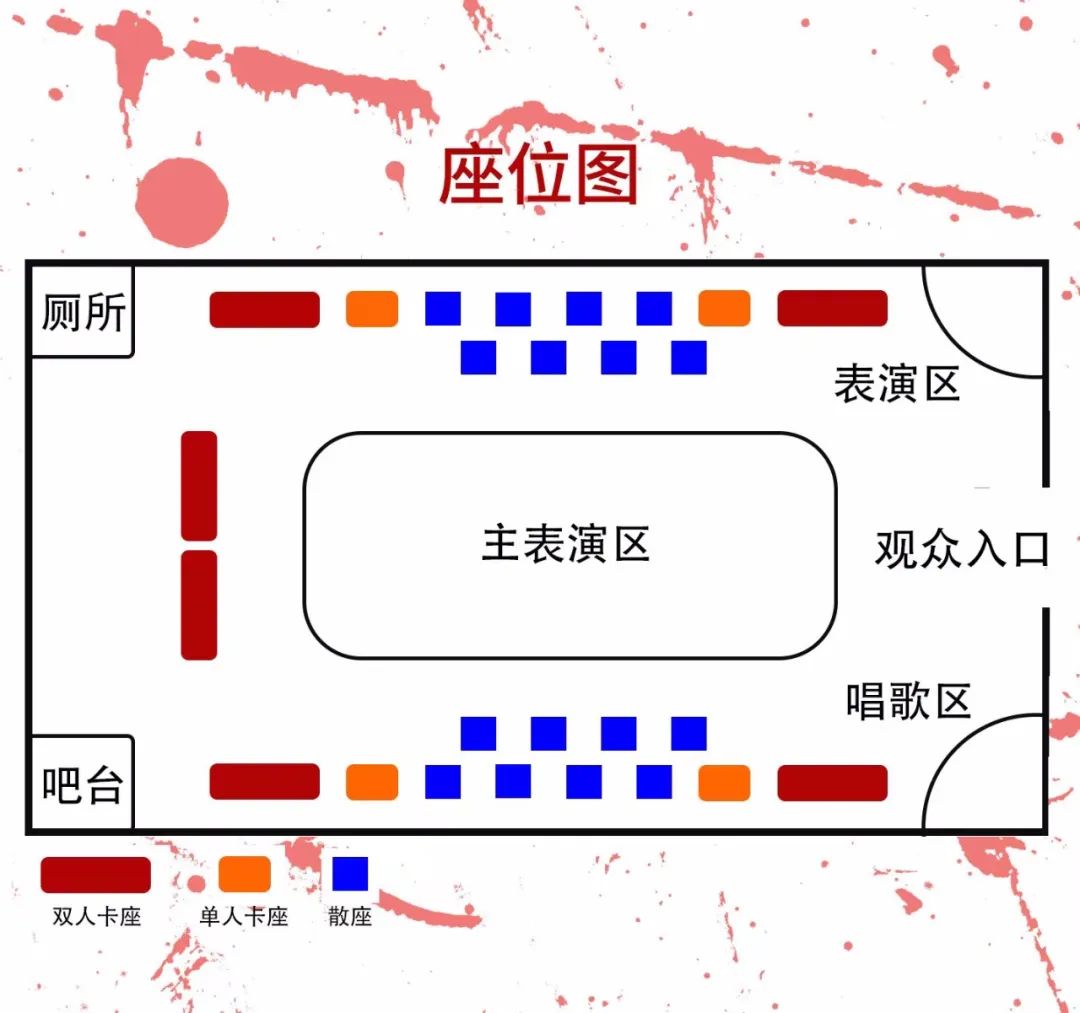 本剧座椅360度包围舞台,演员在观众区随意穿插。座椅分卡座和露营椅,在场内遇到任何问题,都可以找演员、本集团员工及酒吧服务员进行咨询。