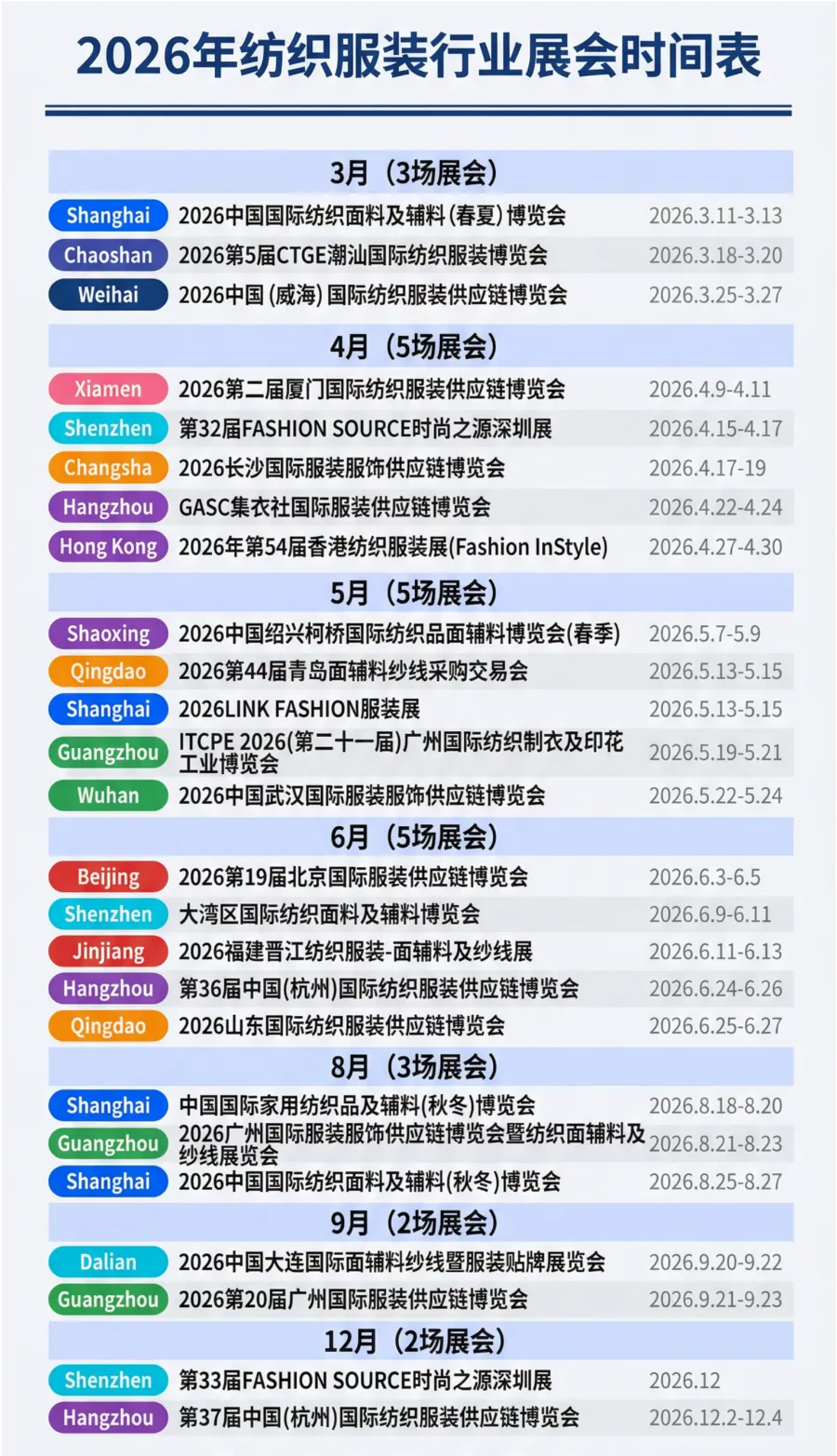 2026全年24场重点纺织服装展会,涵盖面料、辅料、服装、供应链等多个细分领域,为您提供一份完整的展会日历。于纺织服装行业的从业者而言,这是一个充满机遇与挑战的年份。展会作为行业交流、采购、展示的重要平台,已成为企业拓展市场、寻求合作的必经之路。春季是传统的采购旺季,众多品牌和买家集中参展,是寻求合作的黄金时期。6月展会多为专业性采购交易会,参展商质量高,采购意向明确。秋冬款采购集中在8-9月进行,是秋冬季产品的重要展示窗口。年末展会为来年春季采购做准备,是规划新一年合作的重要节点。- 展会名称:国际纺织面料及辅料博览会、LINK FASHION服装展、家用纺织品及辅料博览会等