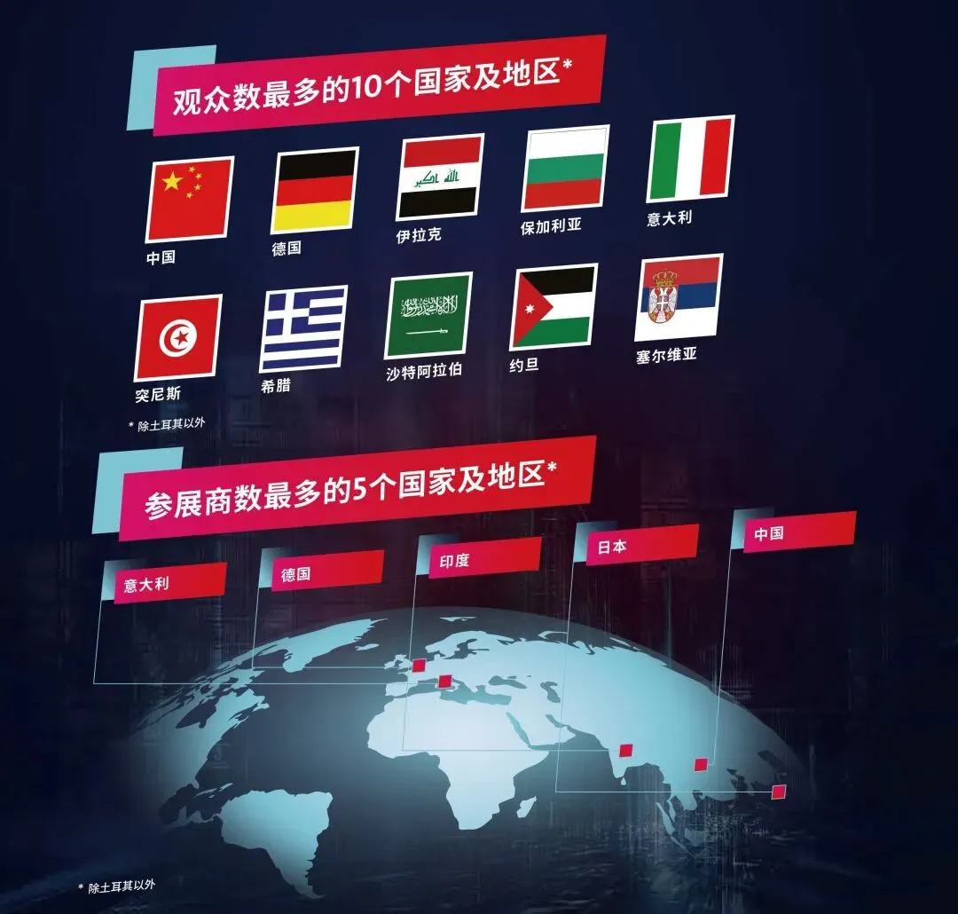 在土耳其机械出口商协会(MAİB)、土耳其机械联合会(MAKFED) 和汉诺威展览会(土耳其)有限公司全球网络的支持下,“特邀买家计划” 计划组织接待来自 17 个国家及地区的超200名重要买家与现场展商进行商务洽谈,包括阿尔巴尼亚、阿尔及利亚、阿塞拜疆、埃及、伊朗、伊拉克、约旦、哈萨克斯坦、黎巴嫩、马其顿、摩洛哥、罗马尼亚、塞尔维亚、突尼斯和乌兹别克斯坦等。2024年,特邀买家与参展商进行了600+场次的会谈。