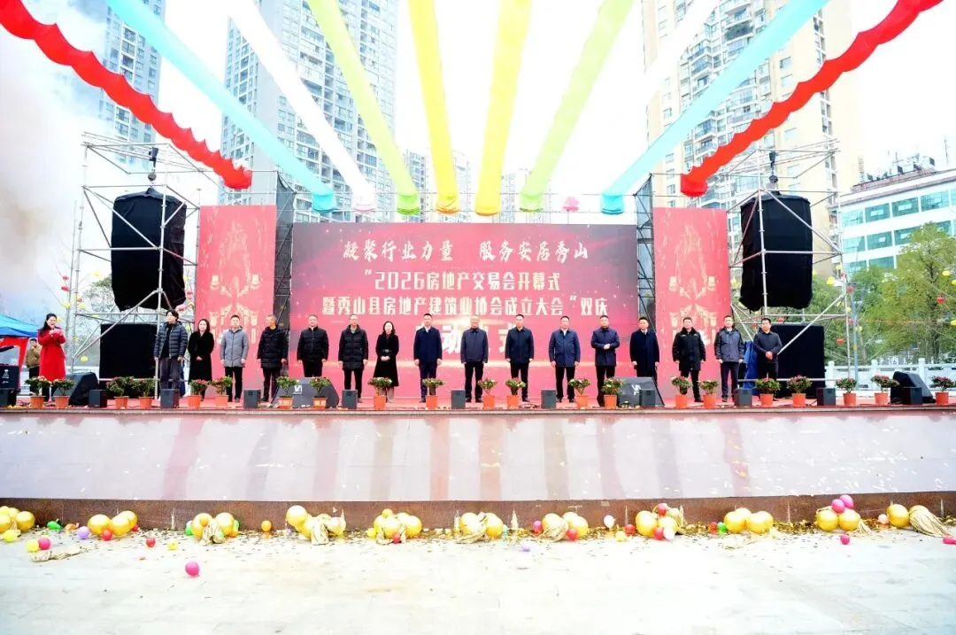 1月22日,秀山房地产建筑业协会成立大会暨2026房地产交易会开幕式在花灯广场举行。县人大常委会副主任向照勇,县政府副县长杨国洪,县政协副主席黄炳光出席活动。