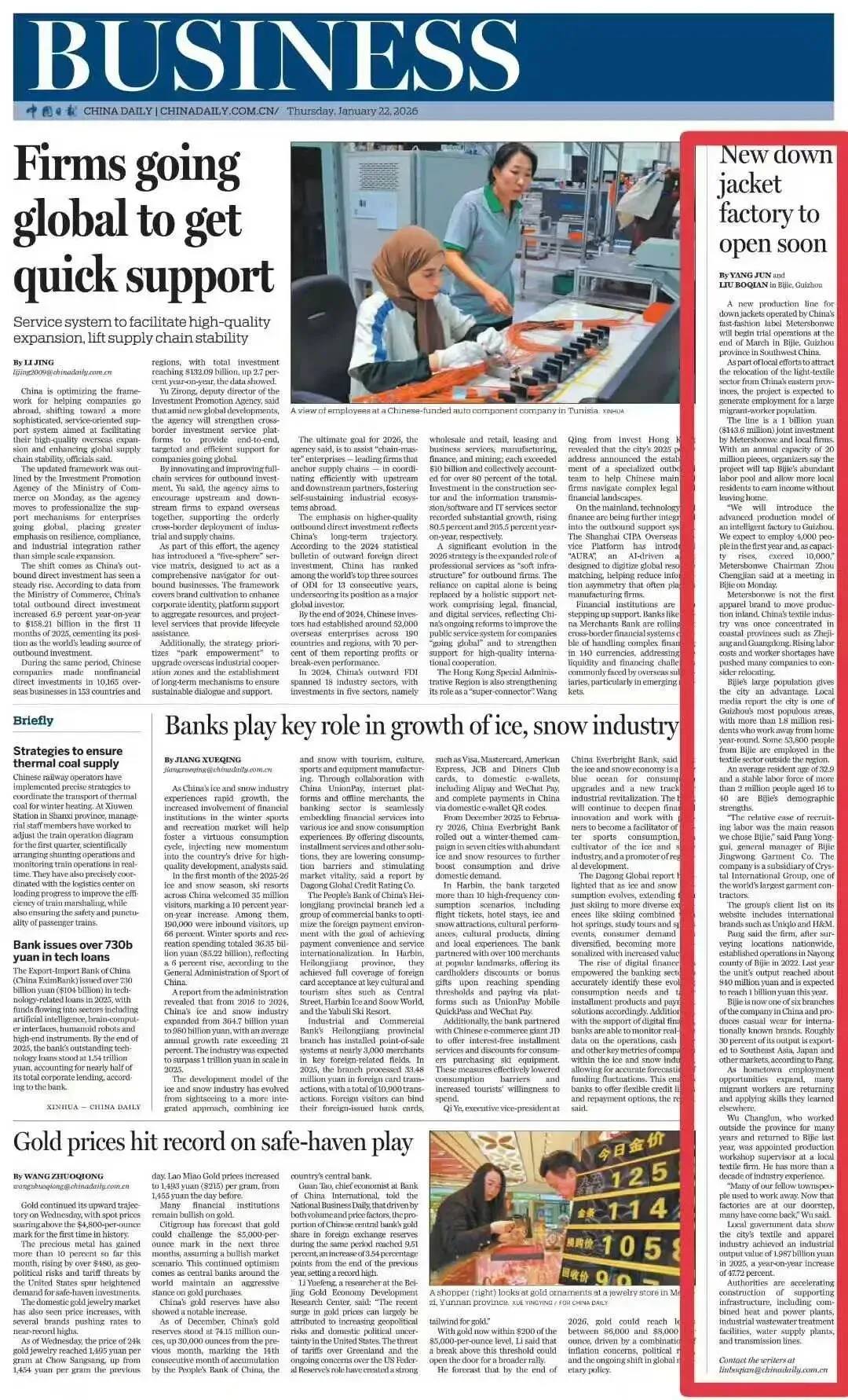 1月22日,中国日报旗舰版13版刊发New down jacket factory to open soon(毕节:智能服装生产线投产在即)
