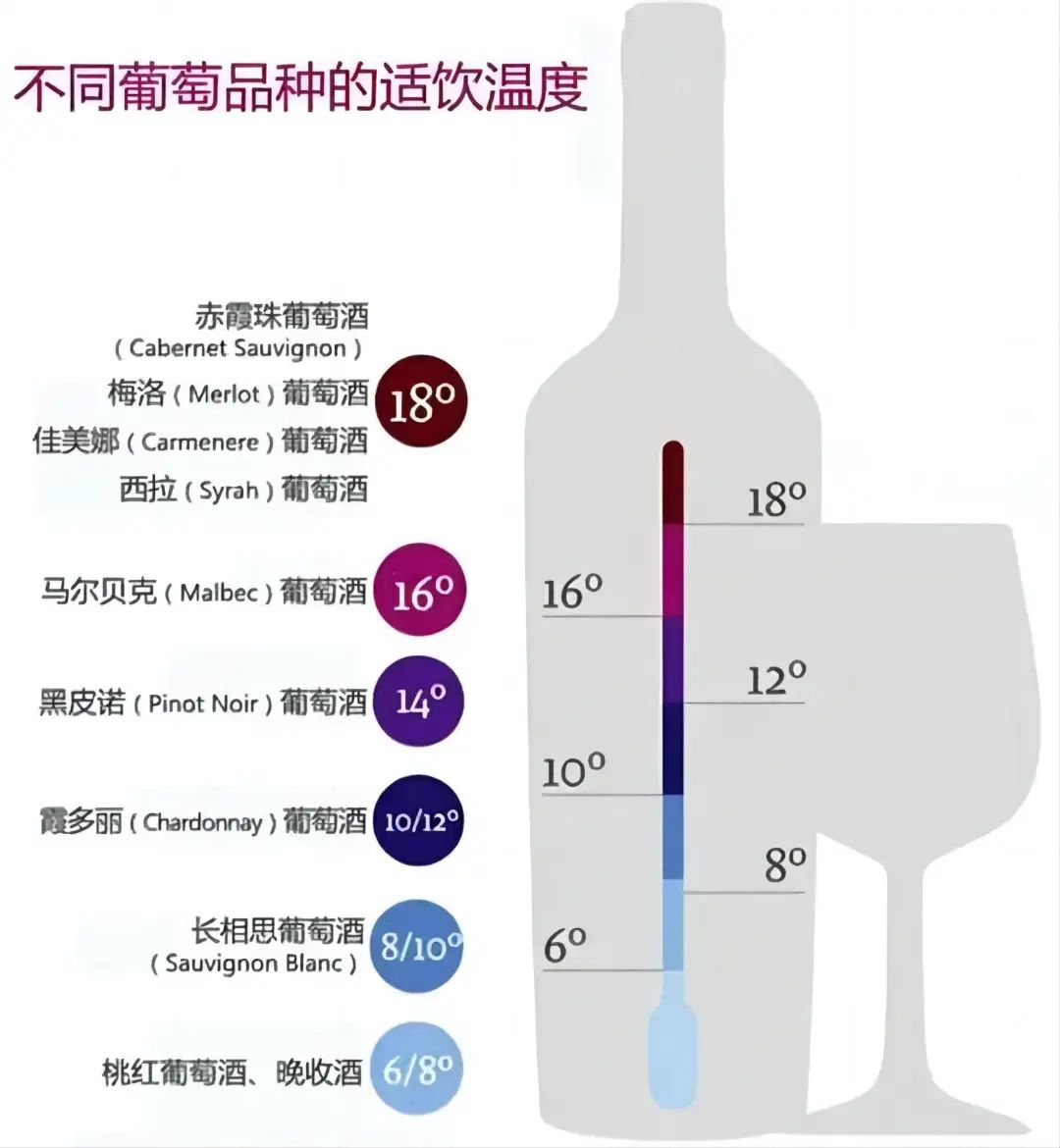 ①白葡萄酒:建议适饮的温度为8-12摄氏度,其中比较轻盈的白葡萄酒适饮温度偏低,比如霞多丽、雷司令等;而比较丰满、浓郁的白葡萄酒则适饮温度偏高。