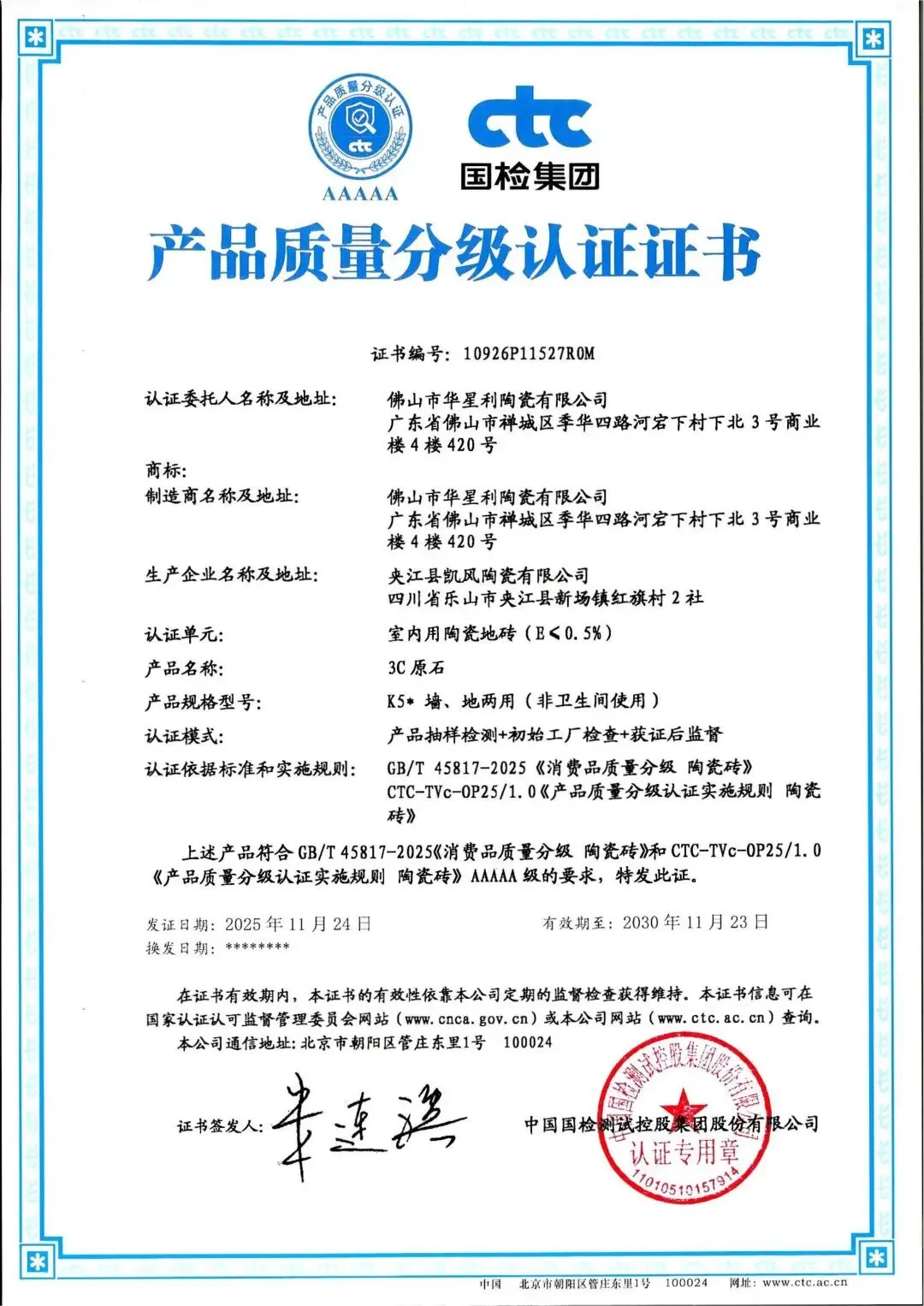 近日,中国国检测试控股集团股份有限公司正式为广乐建陶集团颁发AAAAA级陶瓷砖产品质量分级认证证书。不仅产品通过严苛的5A质量指标的检测,而且工厂生产装备、质量管理体系通过了系统实地查验。