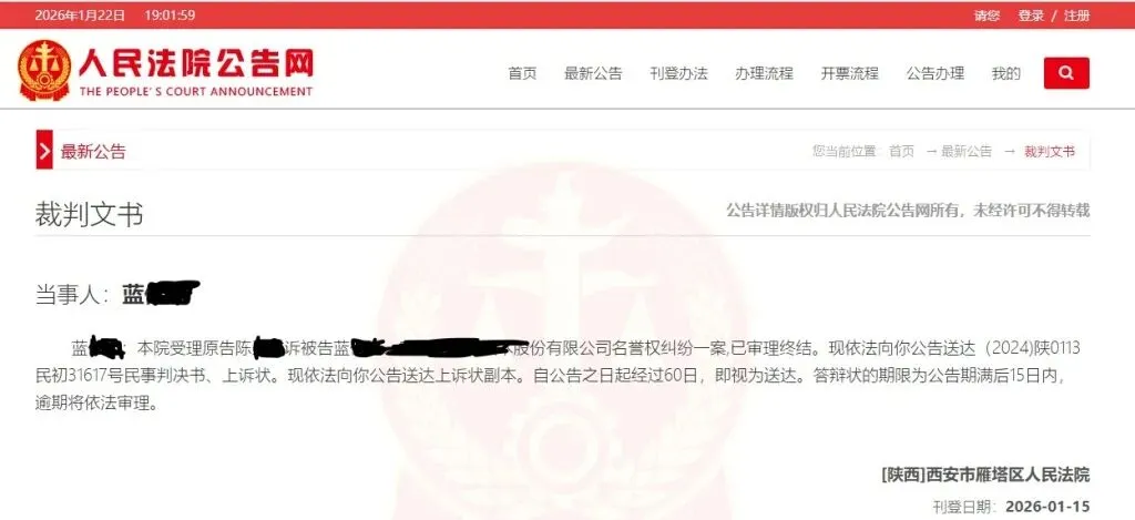 法院公告送达相关文书但是,基于蓝某某身份的知名度与公开性,有理由认为其身份与被告公司存在较高关联性,且案涉公众号所发布的文章目的在于反驳对公司的负面报道,维护公司的商业信誉及企业形象。被告公司辩称:“案涉公众号非公司所有、文章非公司发布”,但公司在明知案涉个人公众号身份与公司存在关联,且多次发布与公司相关文章的情况下持放任态度,对损害结果的发生存在过错。