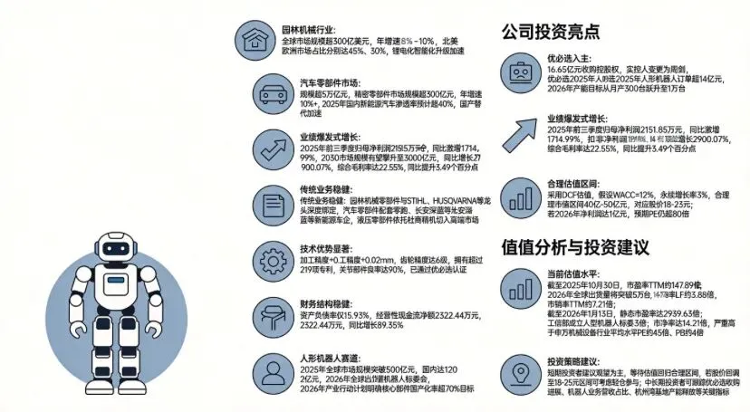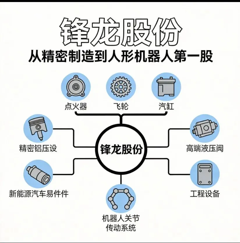 锋龙股份作为一家深耕精密制造领域二十余年的专精特新企业,凭借在园林机械零部件、汽车零部件和液压零部件三大业务板块的技术积累和客户资源,奠定了坚实的发展基础。2025年末与优必选的战略合作,为公司打开了人形机器人这一万亿级赛道的增长空间,有望实现从传统制造向高端智能装备的转型。