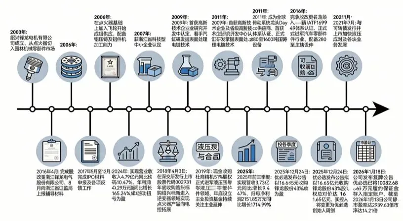 2003年,锋龙股份前身绍兴锋龙电机有限公司成立,从点火器切入园林机械零部件市场。公司坚持自主创新,2006年在点火器基础上加入飞轮,开始成组供应,并配备铝压铸及铝件机加工能力。2007年获浙江省科技型中小企业认定,2009年首获高新技术企业及省级高新技术企业研究开发中心认定,同年着手汽缸研发,掌握表面处理电镀技术。这一时期,公司逐步掌握了年产千万套级别的点火控制技术,为后续发展奠定了技术基础。
