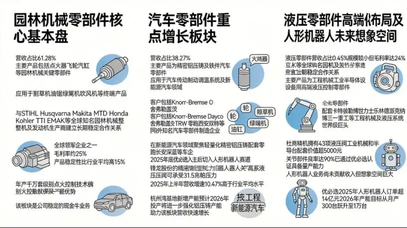- 传统业务稳健:园林机械零部件领域地位稳固,与STIHL、HUSQVARNA等龙头深度绑定;汽车零部件配套零跑、长安深蓝等新能源车企,受益于新能源汽车渗透率提升;液压零部件依托杜商精机切入高端市场,技术壁垒显著。