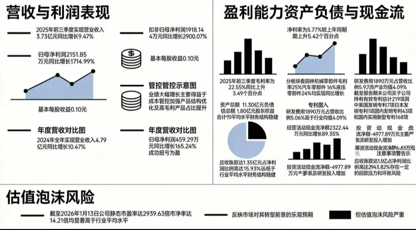 - 业绩爆发式增长:2025年前三季度归母净利润2151.85万元,同比激增1714.99%;扣非净利润1918.14万元,同比增长2900.07%。综合毛利率达22.55%,同比提升3.49个百分点,盈利能力显著增强。