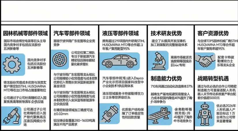 - 园林机械零部件领域:国际市场由博世、电装等巨头主导,国内竞争对手包括应流股份、五洲新春等。锋龙股份凭借成本优势与深度客户绑定(如STIHL、HUSQVARNA、MTD等),在出口市场占据重要地位。