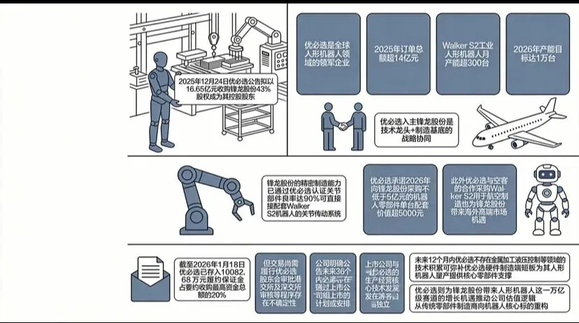 2025年12月24日,优必选公告拟以16.65亿元收购锋龙股份43%股权,成为其控股股东。优必选是全球人形机器人领域的领军企业,2025年订单总额超14亿元,Walker S2工业人形机器人月产能超300台,2026年产能目标达1万台。