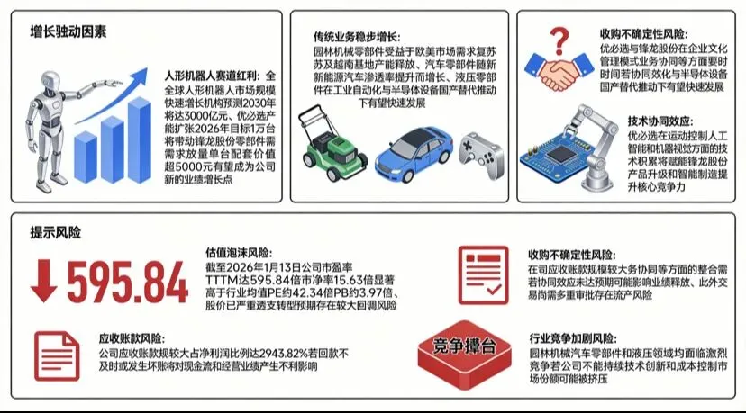 - 人形机器人赛道红利:全球人形机器人市场规模快速增长,机构预测2030年将达3000亿元。优必选产能扩张(2026年目标1万台)将带动锋龙股份零部件需求放量,单台配套价值超5000元,有望成为公司新的业绩增长点。