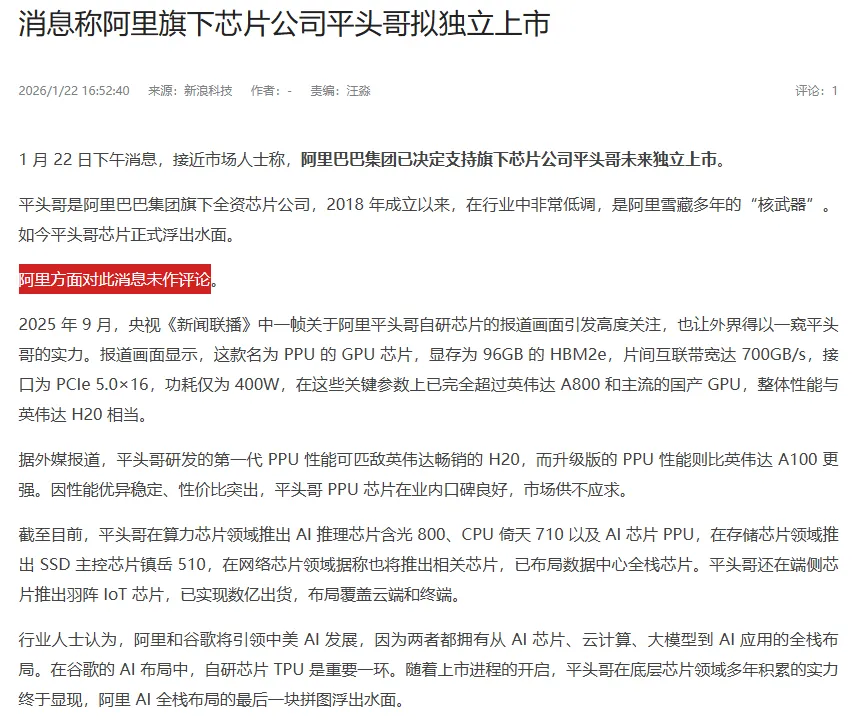 消息称阿里旗下芯片公司平头哥拟独立上市!