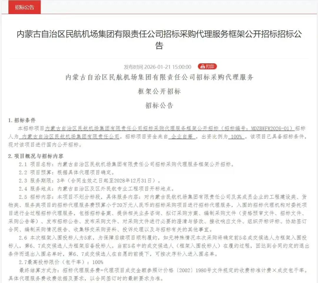 近日,内蒙古电力集团内蒙古蒙电招标公司顺利完成内蒙古自治区民航机场集团有限责任公司招标采购代理服务框架公开招标项目挂网工作。作为公司本年度首个正式落地的外部市场项目,此次突破不仅实现了业务范围的跨领域拓展,更充分彰显了公司在招标代理服务领域的过硬专业素养与高效服务水平,为企业市场化转型注入强劲动能。
