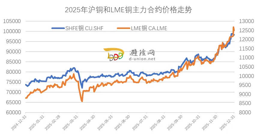 2025年,全球铜价波段上行,沪铜主力合约年内上涨33%,LME伦铜主力合约价格涨幅更是超过42%。回顾全年走势,铜价并非单边上扬而是呈现出一波三折的“过山车”式行情。上半年急涨急跌、区间震荡,下半年则是单边上行、屡创新高;其核心矛盾在于“强现实与弱预期的博弈”。