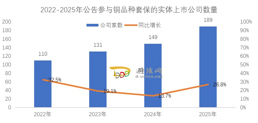 避险网长期跟踪研究上市公司套期保值实践,一直关注参与铜套保的上市实体公司群体发展趋势。过去20年,参与铜套保的上市公司数量有了显著增长;2025年,在公告中明确参与铜套期保值的实体上市公司数量达到189家,再次创下历史新高。