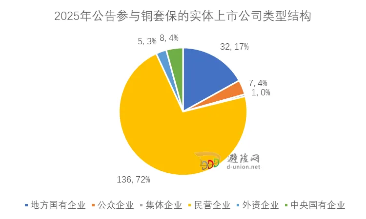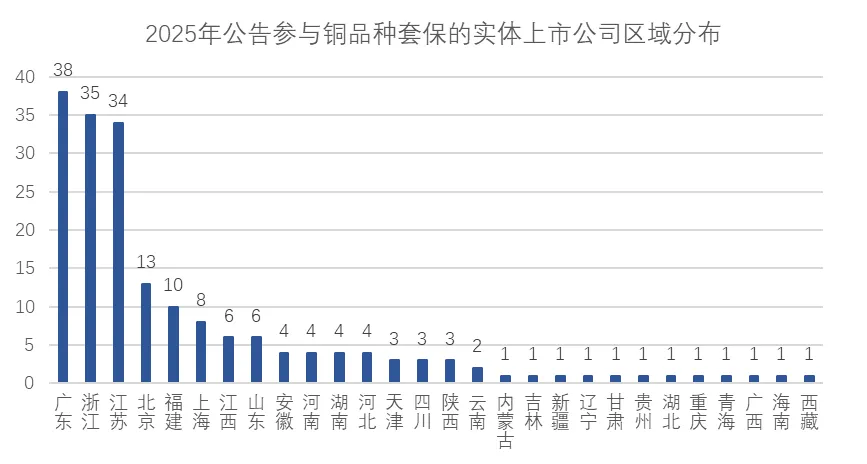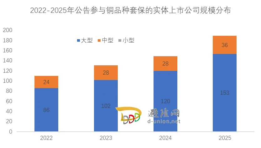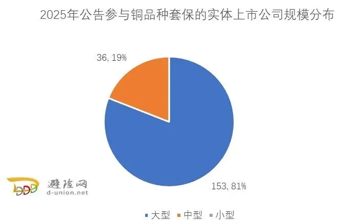2025年初,铜价自低位震荡上行,沪铜主力合约于3月触及阶段性高点83,060元/吨;然而,行情随即急转直下,至4月9日一度下探至71,060元/吨,之后进入反弹修复与震荡整理阶段。进入下半年,尤其是第三季度后,铜价在多重因素支撑下重拾涨势。到12月底,沪铜期货价格收在98,240元/吨,全年上涨33%;LME铜价也同步走高,收在每吨12496美元,全年涨幅超过42%。2026年1月,全球铜价继续上涨,沪铜和LME伦铜一度突破105,500元/吨、13,300美元/吨。究其原因,供需紧张是支持铜价上涨的基本面因素。从需求端来看,以新能源车、风光电为代表的绿色需求,中国持续的电网投资以及全球工业科技用铜需求增长,构成了全球铜消费的坚实基础。而供应端则出现紧缩态势,2025年全球主要铜矿产区(如智利、秘鲁)扰动不断,多家国际矿企下调产量指引,导致铜精矿供应持续紧张。同时,全球贸易与地缘局势动荡、全球显性库存处于历史偏低水平,都加剧了市场波动和资金的避险情绪。尤其是,特朗普政府将征收精炼铜关税的预期加剧了全球区域间铜供需(错配)紧张,影响全球铜价。数据显示,过去4年,在相关公告中明确表示参与铜套保的实体上市公司[1]累计共有217家,呈现出明显的逐年增长趋势、年均复合增长率为23%。这种趋势是由铜价波动、国家政策推动、交易所持续市场培育和企业风险管理意识提升等因素综合影响后的结果。具体到2025年,公告参与铜套保的实体上市公司家数为189家,同比2024年增加40家,增幅为26.8%,较2023、2024年的年度增长明显提速。图2:2022-2025年公告参与铜品种套保的上市实体公司数量从参与铜套保企业的规模来看,2025年参与铜套保的实体上市公司中,大型企业有153家、占比81%;中型企业36家、占比19%。图3:2025年公告参与铜品种套保的实体上市公司规模分布更长时间的数据也表明,大型企业是上市实体公司参与铜套保群体的主力军,如图4所示,2022-2025年大型企业家数占比一直保持在80%左右。图4:2022-2025年公告参与铜品种套保的实体上市公司规模分布从年度增速来看,过去三年铜套保新军主要也是来自大型企业——大型企业参保家数从2022年的86家增长到2025年的153家、增加了67家,保持了21%左右的年复合增长。相比之下,中型企业同期的增加数量只有12家,年复合增速只有15%不到。2025年公告参与铜套保的189家上市实体公司中,民营企业有136 家,外资企业有5家,公众企业有7家,集体企业有1家,央企和地方国企分别有8家、32家。非公有制企业(指非央国企、集体企业)合计148家,占比为78%。图5:2025年公告参与铜品种套保的实体上市公司类型结构3.从地域分布来看,铜套保企业聚集在长三角、广东区域