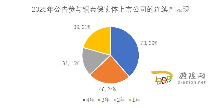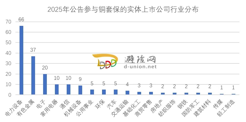 2025年,广东、浙江、江苏、北京、福建地区的实体上市公告参与铜套保的数量是最多的,分别有38家、35家、34家、13家、10家。从过去4年增速趋势来看,上述5个省市的铜套保实体上市公司数量保持了持续增长。其中,北京地区从2022年的4家到2025年的13家,增加了2倍;江苏地区则是从15家增加到34家,翻了一番;广东地区从22家增加到38家,增幅73%;福建地区从9家增加到10家,基本平稳。图6: 2025年公告参与铜品种套保的实体上市公司区域分布根据2022-2025年的累计数据,公告参与铜套保的企业主要集中在长三角、广东地区。长三角地区企业数量占比保持在40-50%之间,而广东地区的家数占比则大约在18-20%,两个地区合计每年占比保持在六成左右。这些地区拥有数量庞大的中下游制造加工企业,铜是他们的重要的核心生产原料,对铜价的风险管理需求较大。在2025年公告参与铜套保的189家实体上市公司中,过去4年每年均发布铜套保的上市公司有73家、占比39%;在3个不同年份发布铜套保公告的上市公司有46家、占比24%;在2个不同年份发布铜套保公告的有31家、占比16%。图7: 2025年公告参与铜品种套保的实体上市公司的连续性表现进一步分析发现,在2个及以上的不同年份发布铜套保公告的实体上市公司共有150家。这其中,在首次发布后、后续每年持续发布铜套保公告的上市公司共有136家,这意味着有占比高达91%的铜套保参与上市公司,一旦参与铜套保后就会持续每年开展下去。可见,上市实体公司参与铜套保的粘性较高,这些实体上市公司在企业风险管理体系中,持续使用铜套保工具来部分对冲、规避铜价格波动风险。2025年公告参与铜套保的189家实体上市公司来自19个不同的行业[1],除了电力设备、有色金属、电子行业之外,家电、通信、机械设备、环保以及汽车行业均有上市公司公告参与铜套保。参与铜套保的上市公司基本覆盖了产业链全环节。上游铜矿企业如云南铜业、北方铜业、盛达资源;中游冶炼企业如株冶集团、恒邦股份;中下游加工环节如铜冠铜箔、海亮股份、正泰电器、美的集团、万马股份;物流贸易环节如远大控股、中储股份等均积极开展套保业务。图8: 2025年公告参与铜品种套保的实体上市公司行业分布3.越来越多的实体上市公司使用铜期权灵活开展组合套保